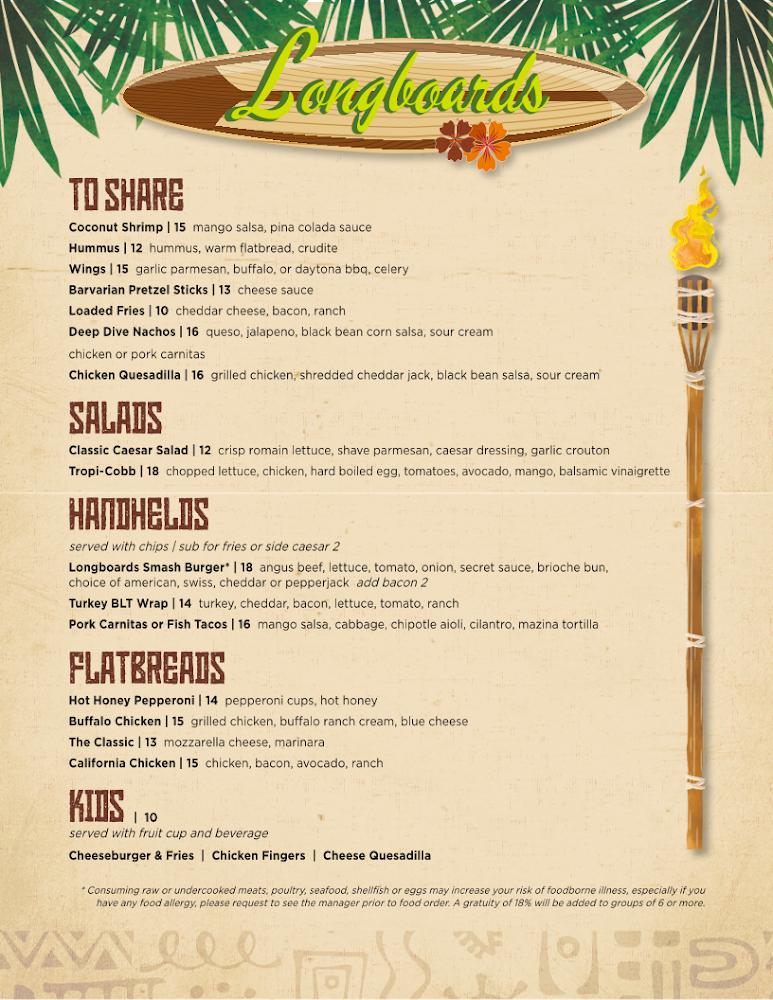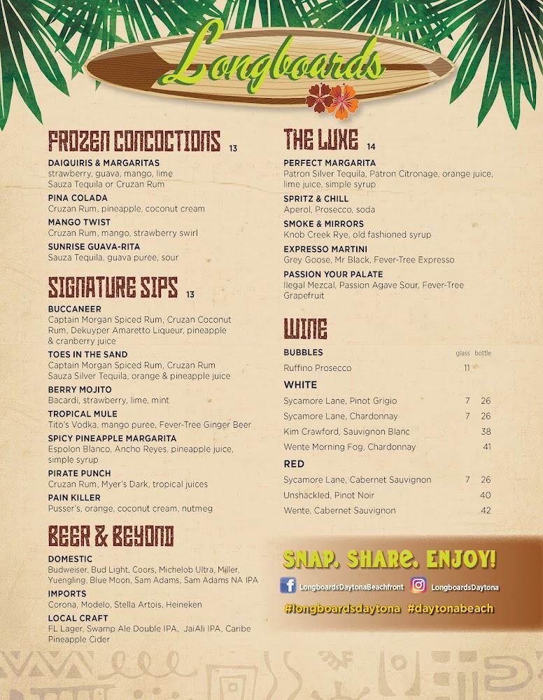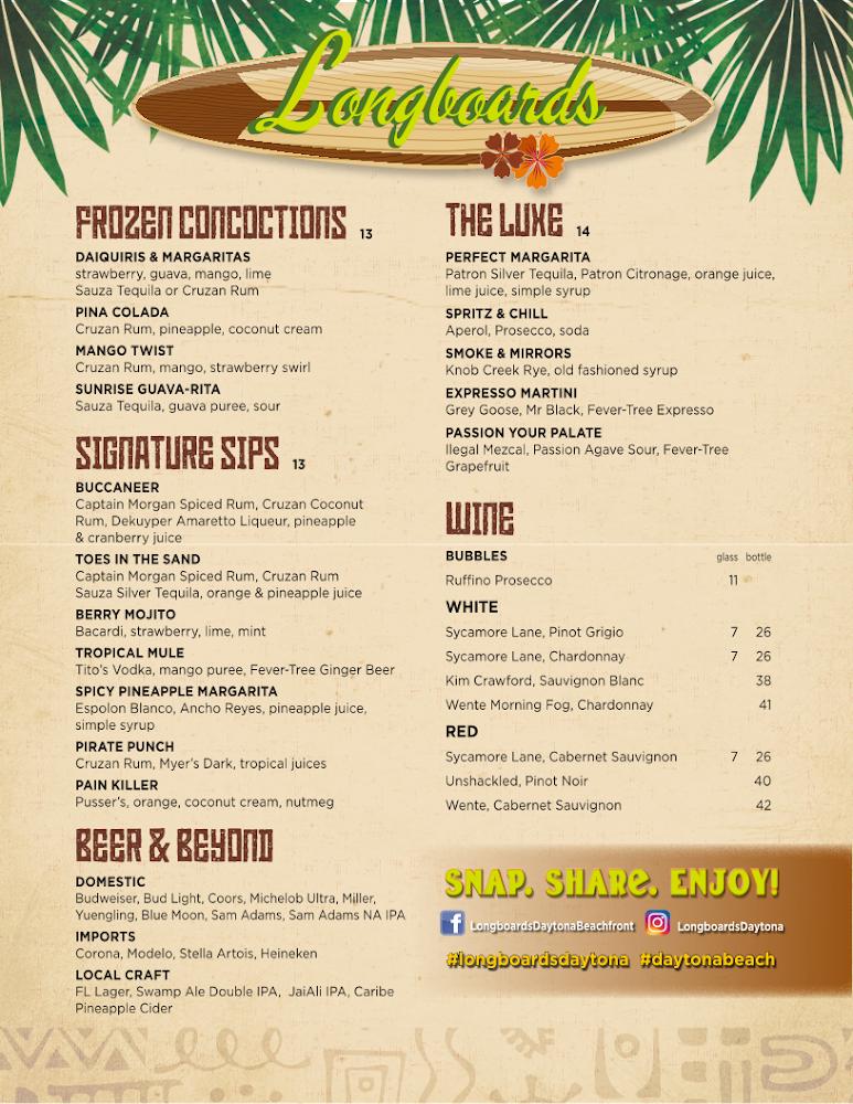 Welcome to Longboards Daytona Beachfront, your go-to beachside bar at the Hampton Inn Daytona Beachfront. Delight in our mouthwatering grilled dishes and refreshing cocktails, all while soaking in breathtaking ocean views. Whether you’re enjoying lunch, dinner, or a solo bite, our vibrant atmosphere offers live music and a wide selection of local beers. With accessible seating and takeout options, we cater to every guest's needs. Join us for a happy hour treat or relax on our terrace overlooking the waves. Experience the perfect blend of delicious food, great drinks, and stunning beach scenery at Longboards!